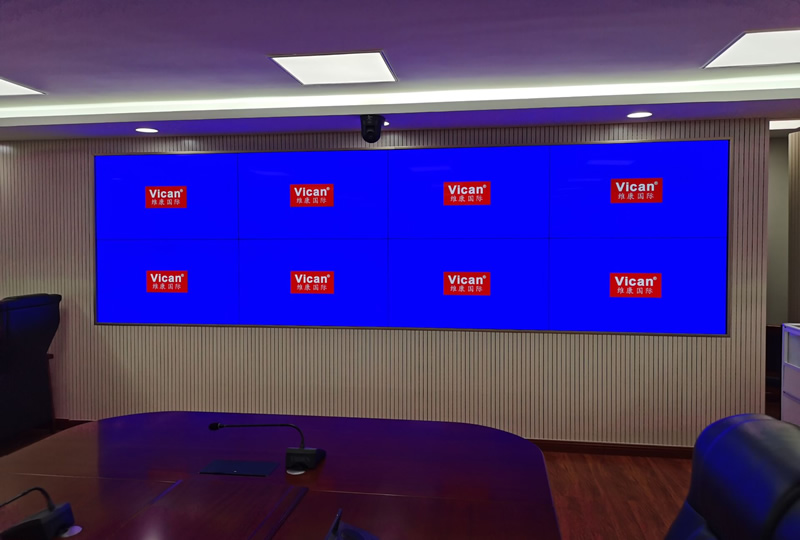 該案例中,維康國際為濰坊市某政府提供一條會議顯示屏,采用2行4列的55寸液晶拼接屏,超小拼縫設(shè)計,雙邊拼縫僅有0.88mm,大屏幕畫面清晰亮麗,一體化顯示效果很好,基本不受拼縫影響,采用內(nèi)嵌式安裝,大屏與畫面形成一體,更顯美觀時尚。