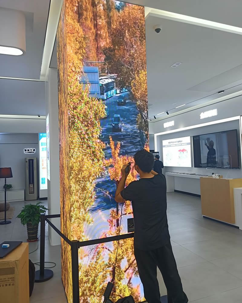 本案例中,是維康國際深圳市某營業(yè)廳提供的一套柱子LED顯示屏,畫面顯示清晰亮麗,有著很好的視覺體驗(yàn)效果。