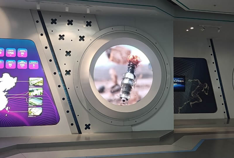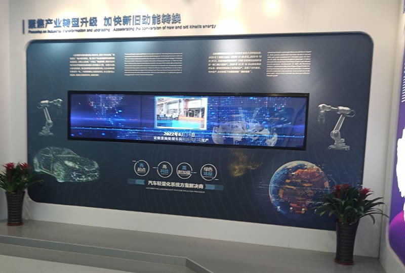 本案例中,維康國(guó)際為山東魏橋創(chuàng)業(yè)集團(tuán)的展廳提供了多套多形狀的LED顯示屏,如上圖所示,由梯形、圓形、長(zhǎng)方形拼接組成,大屏幕顯示清晰,視覺體驗(yàn)效果好。