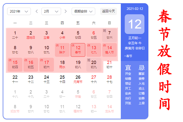 根據(jù)國家春節(jié)放假的規(guī)定,結(jié)合公司實際經(jīng)營的狀況,經(jīng)董事會決定,對2021年春節(jié)的放假時間如下: