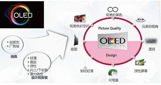 自發(fā)光、廣色域、輕薄、曲面拼接、彈性、可彎曲、透明。