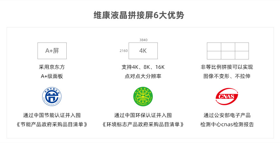 京東方55寸0.88mm液晶拼接屏通過了節(jié)能認證、CNAS檢測報告、環(huán)保認證、抗震防塵、CE、CB、FCC、ROHS、外觀專利、大屏軟件專利等。