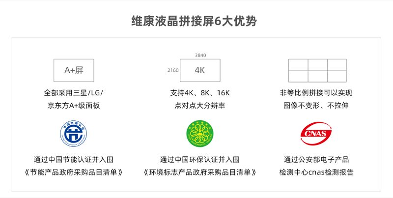 維康國際通過了ISO9001質(zhì)量管理體系、ISO14001、OHSAS18001、3C、節(jié)能認證、環(huán)保認證、公安部cnas檢測報告、抗震8級、防塵、CE、CB、FCC、ROHS、外觀專利、大屏軟件專利等,在支持客戶參與招投標(biāo)項目中有很大優(yōu)勢。
