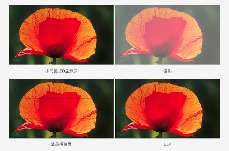 以下是小間距l(xiāng)ed顯示屏、投影、液晶拼接屏、DLP四種主流的大屏顯示技術(shù)的效果對比,通過對比可以看到投影由于對比度低導(dǎo)致屏幕發(fā)白,而液晶拼接屏與DLP大屏都有不同程度的拼縫,而led顯示屏由于點間距只有1.25毫米,所以即沒有拼縫而且分辨率也有保證。